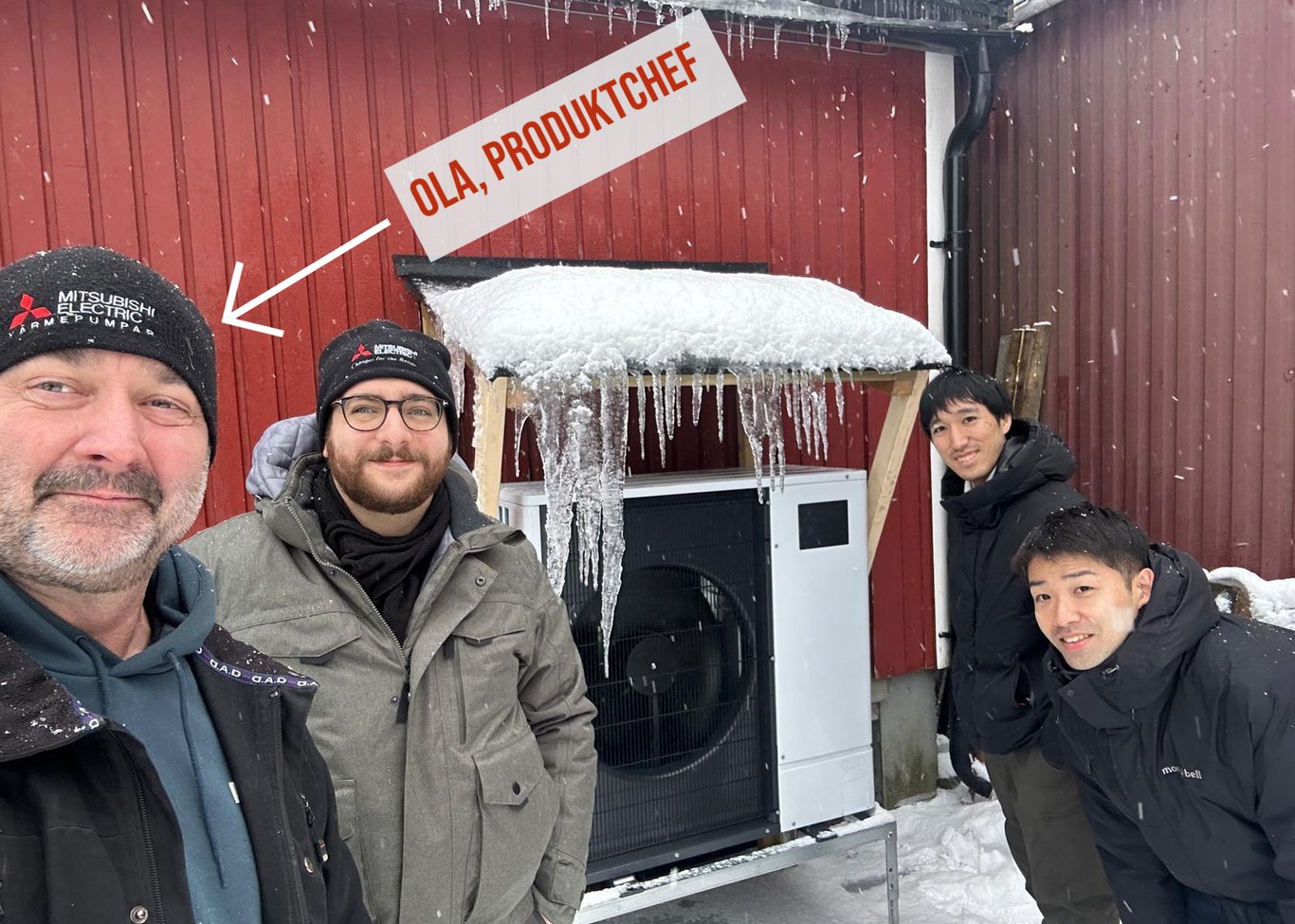 Det här är Ola, en av våra produktchefer. Han har jobbat på Mitsubishi Electric i mer än 15 år. Här är han en kall vinterdag norr om polcirkeln, på en av våra testplatser. Med sig har han kollegor från kontoret i Lund men också två inresta ingenjörer från Japan. Alla är här för att se hur en ny luft-vattenvärmepump uppför sig i extrema minusgrader, snö och is. De vill se med egna ögon att allt fungerar. Det är så de arbetar.